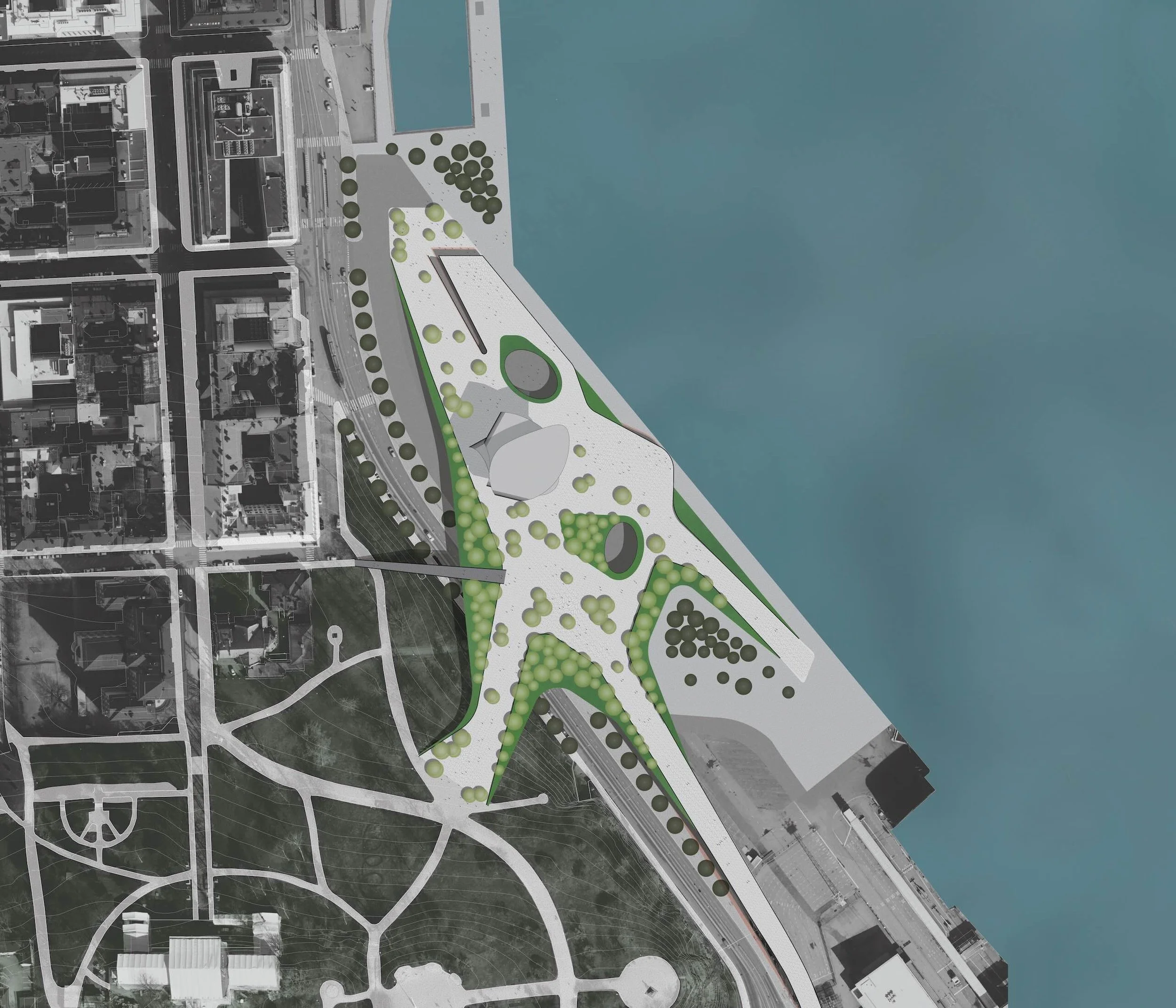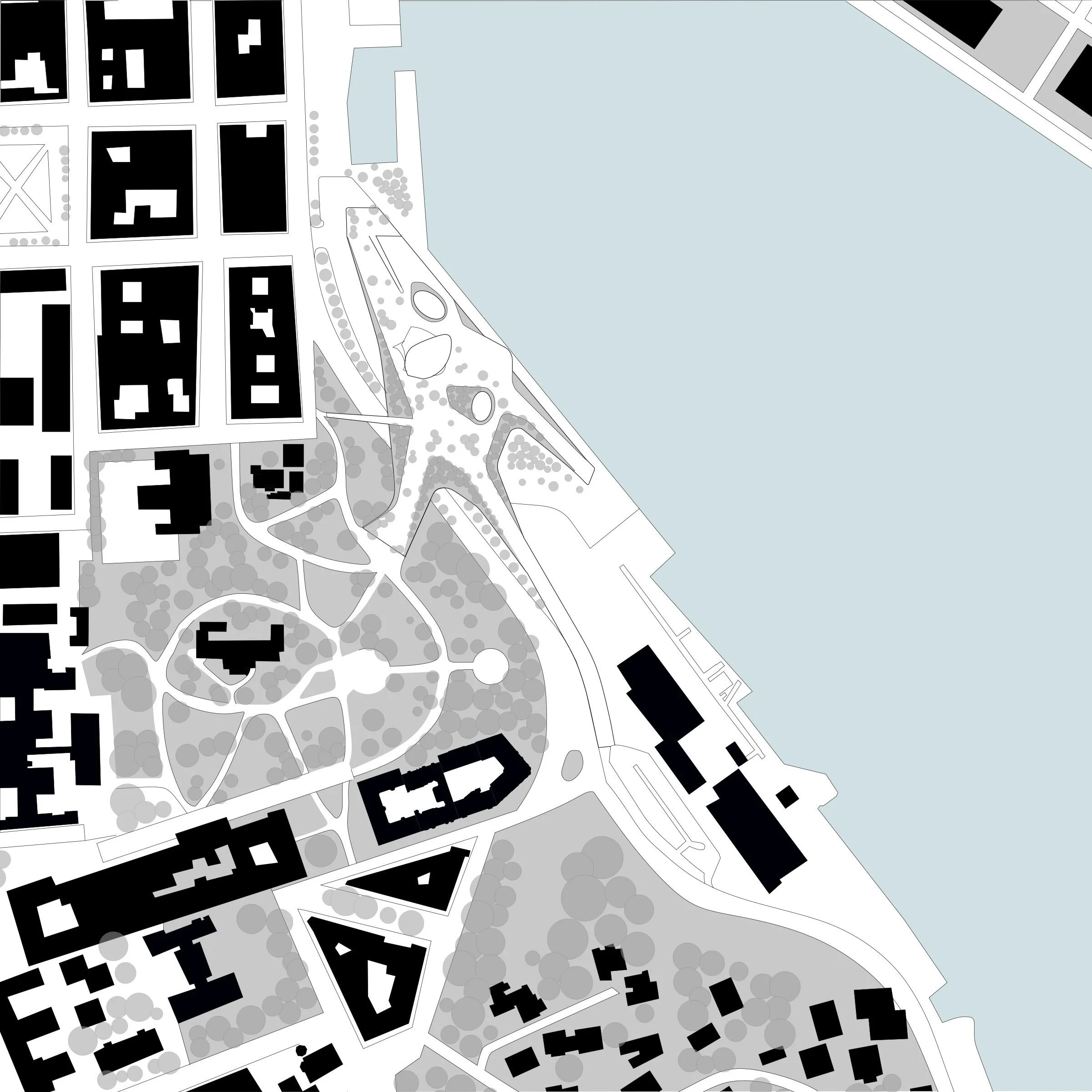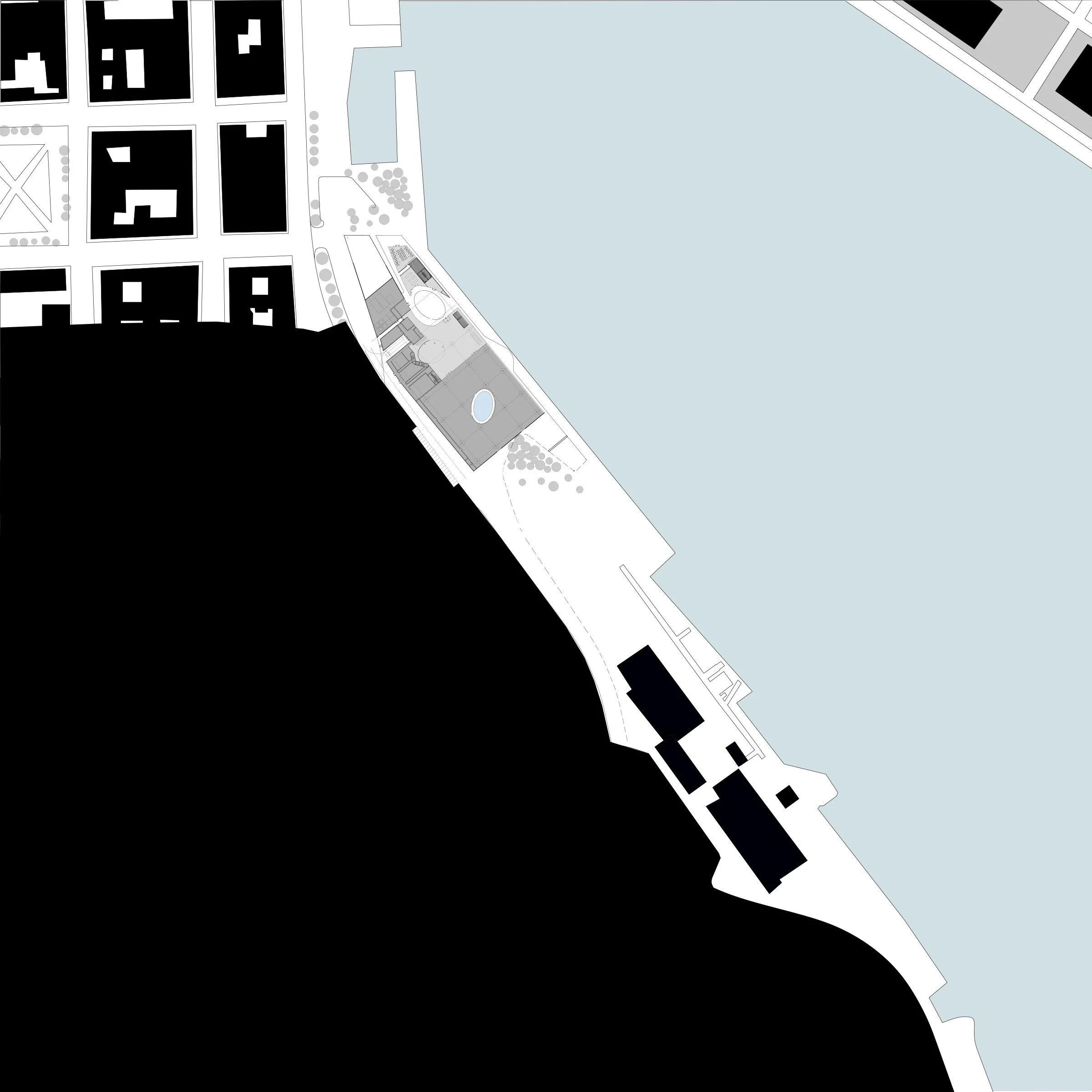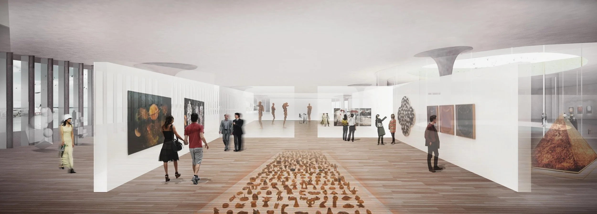 The Guggenheim Helsinki Museum is conceived of as an urban landscape deck connecting Tähtitorninvuoren Park and the urban edge condition along South Harbor. The museum galleries lie below this urban landscape with intermittent connections to the public realm both visually and physically. Rising out of this urban landscape is a tower that serves to house the most public elements of the program. Expressive concrete columns, an undulating curved ceiling, and water court in the center of the galleries impart a phenomenological presence to the space that will contrast from the abstract walls of the gallery exhibition space and divisions.