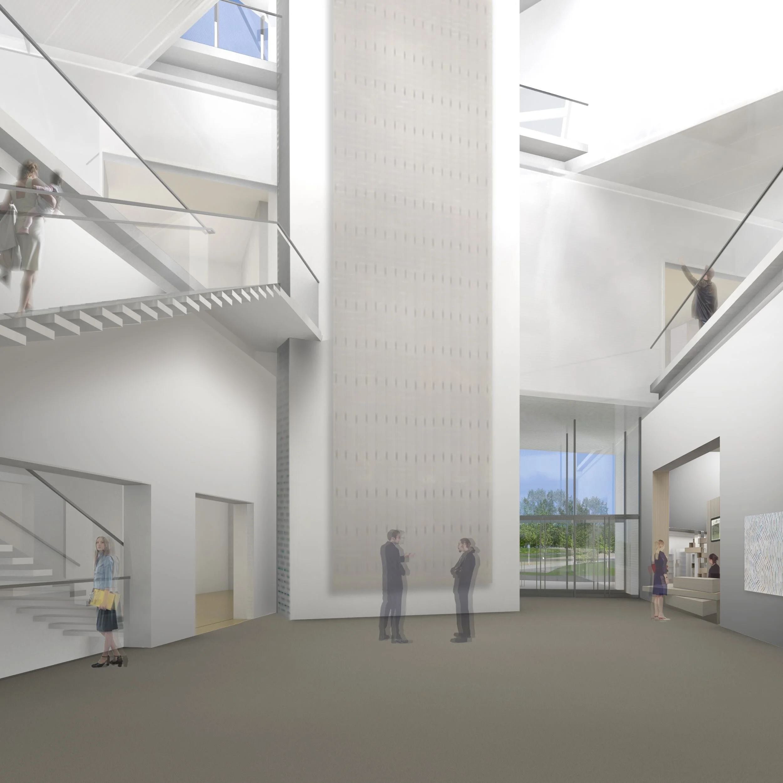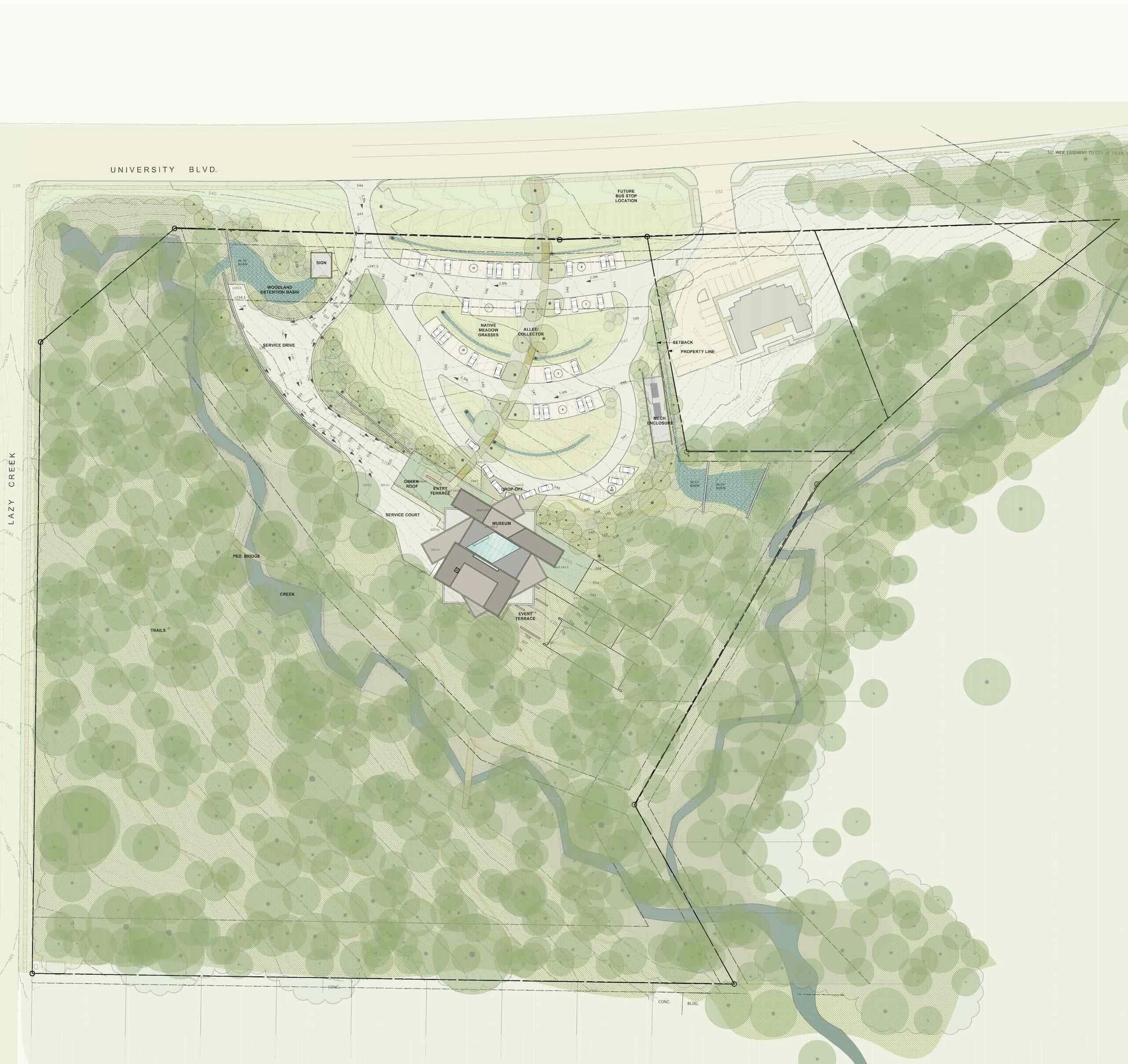 The Tyler Museum of Art, designed on 18-acre site of native east Texas landscape, features sprawling grounds of a restored native grassland and mature woodland, which features a creek running through the site. Conceived as a series of stacked and rotated boxes, the new museum of 40,000 square feet will rotate around a central atrium. The museum will house 12,000 square feet of gallery space, 4,000 square feet of educational area, a new 2,500 square foot events and exhibition hall, and administration offices, on multiple levels, as well as a cafe, museum shop, and research library. The project is targeted for LEED silver certification.